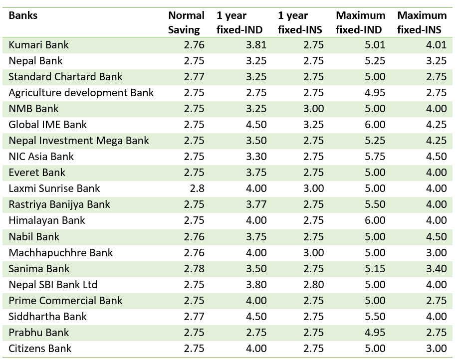 विवरण अनुसार २० वाणिज्य बैंकहरूमध्ये साधारण मुद्दती निक्षेपमा बैंकहरूले न्यूनतम २.७५ प्रतिशतदेखि अधिकतम २.७८ प्रतिशतसम्म ब्याजदर तोकेका छन् । विभिन्न प्रकारका बचत खाताबिच २ प्रतिशत भन्दा धेरै ब्याजदर अन्तर हुन नपाउने व्यवस्था छ भने रेमिट्यान्स खाताको ब्याजदरमा थप १ प्रतिशत विन्दुले ब्याजदर थप्न पाउने व्यवस्था छ । बैंकहरूले त्यही रेञ्जभित्र रहेर विशेष खाता तथा रेमिट्यान्स खाताको ब्याजदर निर्धारण गरेका छन् ।