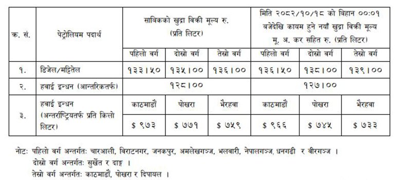निगमले डिजेल र मट्टीतेलको मूल्य लिटरमा तीन रुपैयाँले बढाएको छ। पेट्रोल र खाना पकाउने एलपी ग्यासको मूल्य यथावत् राखिएको निगमले जनाएको छ।