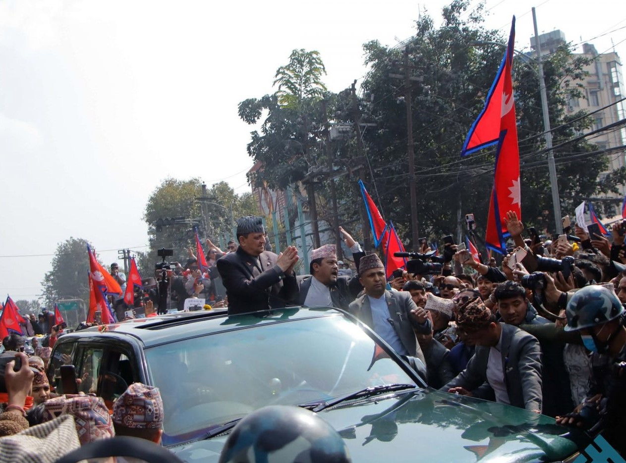 पूर्वराजा ज्ञानेन्द्र शाहको काठमाडौंमा भव्य स्वागत, निषेधाज्ञा विमानस्थलमा सीमित